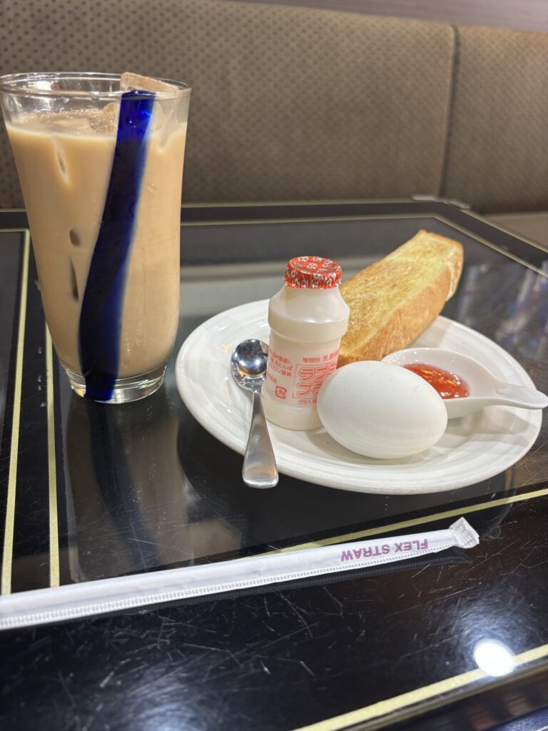 モーニングセットはトースト、ジャム、ゆで卵、ヤクルトでした。